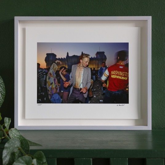 Annette Hauschild Aus der Serie "Verhüllter Reichstag – Die letzte Nacht, Berlin 1995“ I, 1995 / 2025 Material Archival Pigment Print Herstellungsmethode Copyright für den verhüllten Reichstag: Christo und Jeanne-Claude, Verhüllter Reichstag, Berlin, 1971-1995 © Christo and Jeanne-Claude Foundation / VG Bild-Kunst, Bonn, 2025 Auflage 25 Maße Blattmaß 24 x 30 cm Auflage 25 + 3 AP vorderseitig signiert und nummeriert Details zum Rahmen Handgefertigter hellgrauer Ahorn-Holzrahmen, ca. 29,2 x 35,2 cm, inkl. Distanzleiste, inkl. Museumsglas und rückseitiger Aufhängung Die neue Art, Kunst zu kaufen Handverlesene, exklusive Editionen Limitierte, signierte Auflagen Top-KünstlerInnen und Rising Stars Schnell registrieren, um Preis und Verfügbarkeit zu sehen. Jetzt kostenlos Mitglied werden Bereits Mitglied? Über die Edition Wer in den 90ern in Berlin lebte, hat diesen Moment nicht vergessen: Der von Christo & Jeanne-Claude glitzernd verhüllte Reichstag, die Menschenmassen davor. Auch Annette Hauschild war dabei: Als junge Berliner Fotografin hatte sie gerade ihre Ausbildung abgeschlossen und fotografierte von der Demo bis zur Partyszene alles, ob sie einen Auftrag hatte oder nicht. So kam es zu dem Glücksfall dieser "Verhüllter Reichstag - Die Letzte Nacht" betitelten Serie: „Ich habe die letzte Nacht fotografiert, als die Menschen dageblieben sind, um zu warten, bis am nächsten Morgen die Arbeiter kamen und ihn wieder enthüllt haben.“ Entstanden sind drei Bilder einer unvergleichlichen Stadt im Moment des Aufbruchs: Bewusst verwischt porträtiert Hauschild die Nachtschwärmer vor dem leuchtenden ikonischen Gebäude, beobachtet sie beim Tanzen oder Picknicken und dokumentiert mit dem ihr eigenen Pathos die Momente, in denen private und politische Utopie zusammenfielen ‒ ein Geschenk! Über die Künstlerin Annette Hauschild, 1969 in Gießen geboren, zog im Alter von 19 Jahren nach Berlin und wurde in den wilden Nachwendejahren Fotografin: Sie studierte im Lette-Verein und besuchte Arno Fischers legendäre Meisterklasse am Schiffbauerdamm. Seit 1996 ist sie Mitglied der renommierten Fotoagentur Ostkreuz, die sich 1990 gründete, als eine Gruppe von Fotograf*innen aus der ehemaligen DDR. Hauschild war federführend an der im Januar 2025 zuende gegangenen Ausstellung "Träum weiter – Berlin, die 90er" beteiligt. Die Ausstellung bei C/O Berlin gehörte zu den meistbesuchten der Geschichte des Hauses und präsentierte eindrucksvoll in rund 200 Arbeiten Berlin als Stadt im Wandel – beginnend mit dem Fall der Mauer über die lebendige Technoszene bis hin zu den sozialen und wirtschaftlichen Veränderungen Berlins als neue Hauptstadt. Ausstellungen (Auswahl) 2024/25 Träum Weiter! – Berlin, die 90er. c/o Berlin Gruppenausstellung 2021 MISS YOU. Künstler*innen im Lockdown. Open air, dezentrale Orte. Berlin 2020 KONTINENT – auf der Suche nach Europa. Akademie der Künste, Berlin. Gruppenausstellung 2012 Über Grenzen. Haus der Kulturen der Welt, Gruppenausstellung OSTKREUZ Lesenswerte Artikel / Links Annette Hauschild bei Ostkreuz Gruppenaustellung: Träum Weiter — Berlin, die 90er, C/O Berlin Interview - Kuratorin Annette Hauschild: "Träum weiter", radioeins Mehr Kunst entdecken Annette Hauschild Aus der Serie "Verhüllter Reichstag – Die letzte Nacht, Berlin 1995“ II, 1995 / 2025 Annette Hauschild Aus der Serie "Verhüllter Reichstag – Die letzte Nacht, Berlin 1995“ III, 1995 / 2025 Annette Hauschild SET Aus der Serie "Verhüllter Reichstag – Die letzte Nacht, Berlin 1995“ I + II + III, 1995 / 2025 Lycien-David Cséry SET aus der Serie: Cracks and Dents No 2 + No 5 , 2016/ 2025 Klaus Mettig N.Y. 2004 #9 (LIONS), 2004 Thomas Ruff Untitled#1, 2022/25