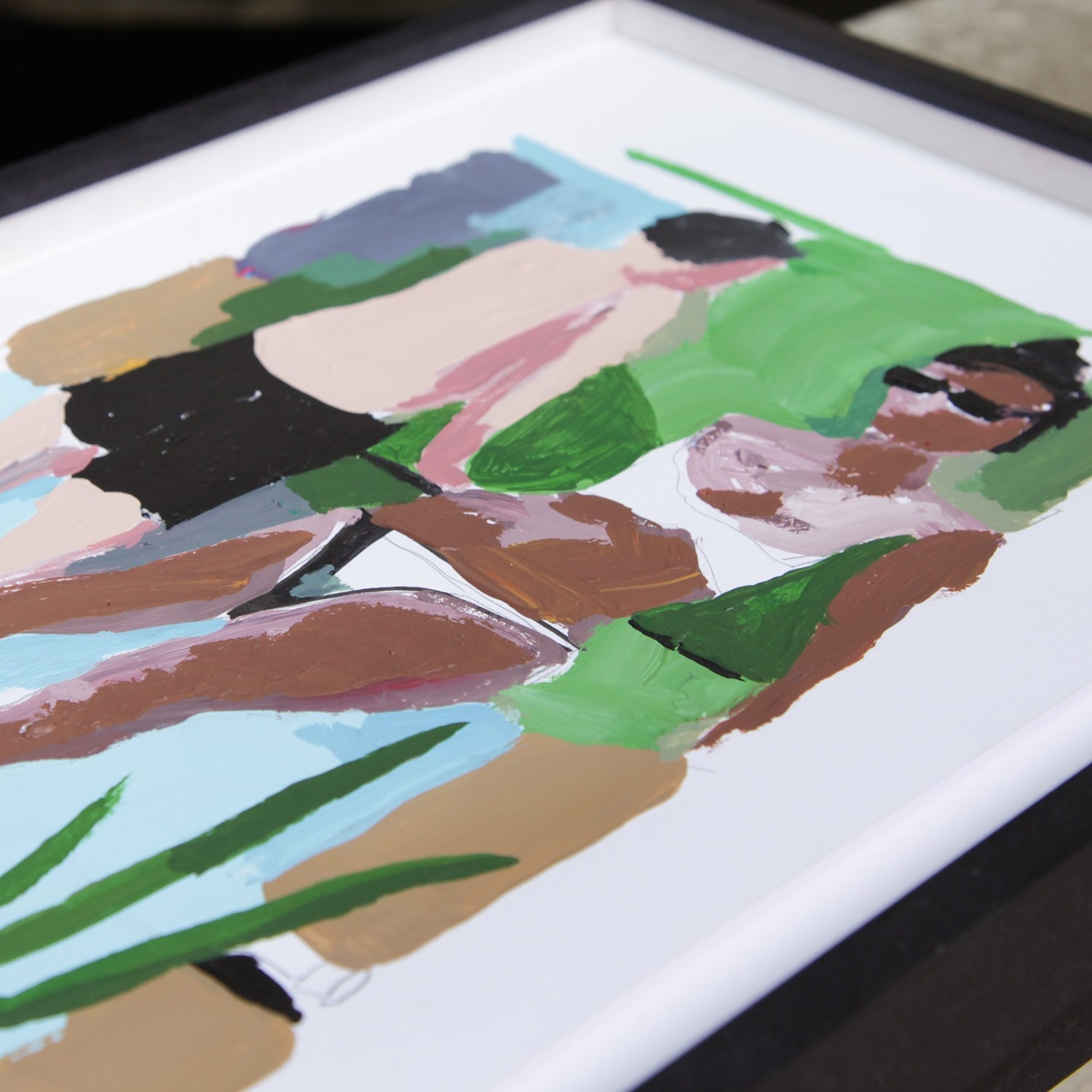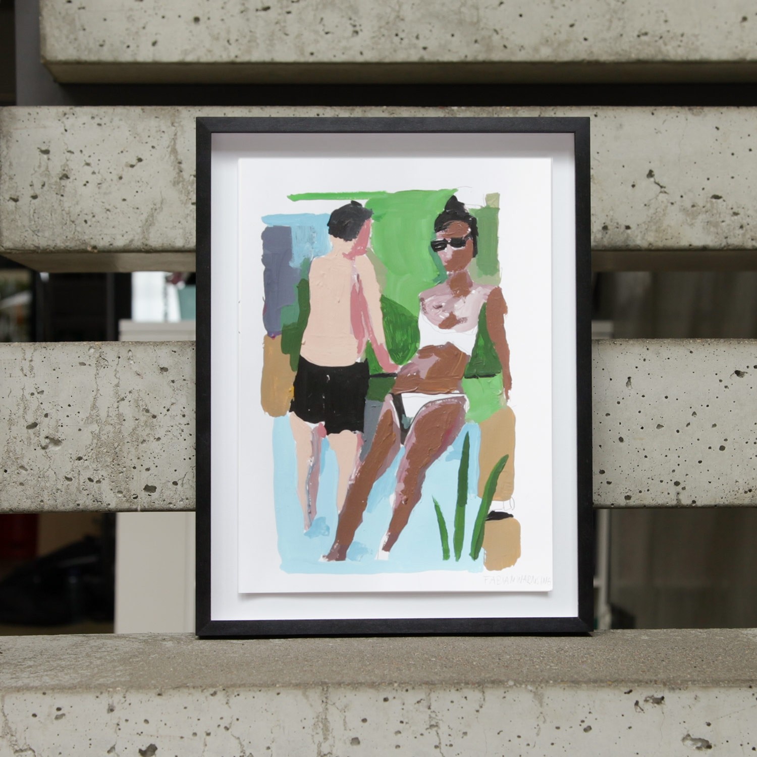 Fabian Warnsing Hot Day Study 2, 2022 Material Acryl und Bleistift auf Papier Auflage 1 Maße 29,7 x 21,0 cm UNIKAT signiert und betitelt Details zum Rahmen Handgefertigter Ahorn-Holzrahmen, schwarz gebeizt und gewachst, Außenmasse ca. 34,9 x 26,2 cm, 10mm Distanzleiste, das Blatt ist hochgestellt montiert, inkl. Museumsglas und rückseitiger Aufhängung. Die neue Art, Kunst zu kaufen Handverlesene, exklusive Editionen Limitierte, signierte Auflagen Top-KünstlerInnen und Rising Stars Schnell registrieren, um Preis und Verfügbarkeit zu sehen. Jetzt kostenlos Mitglied werden Bereits Mitglied? Über das Werk Ob Stillleben oder Akte – der Künstler Fabian Warnsing greift immer wieder auf klassische Motive aus der Kunstgeschichte zurück. Die Badenden am See in seinen auf Bleistiftzeichnungen beruhenden Acrylarbeiten aus der Serie „hotdaystudy 1-8“ erinnern an Cézanne, Kirchner oder Katz. Und doch ist bei Warnsing die Zeitgenossenschaft im Blick auf die Körper, Kleider und Konstellationen nicht zu übersehen. Auch digitale Bilderwelten beeinflussen den Maler stark. Allerdings nicht im Hinblick auf Rendering und Perfektion, denn Warnsings Werke legen Arbeitsprozesse und Korrekturen offen, wie sie auch bildästhetischen Fragestellungen nachgehen, etwa zu Flächigkeit und Tiefe, Figuration und Abstraktion. Solche Bruchstellen lassen Raum für Unsicherheit und Assoziation. Trotzdem oder gerade deswegen sprühen Warnsings Bilderfindungen nur so vor narrativer Kraft. Über den Künstler Fabian Warnsing (geb. 1991 in Unna), ehemaliger Meisterschüler im Bereich Freie Kunst an der Kunstakademie Münster, lebt und arbeitet heute in Berlin. 2020 gehörte er zu den Finalisten des Berlin Masters Award. Seine Werke sind in zahlreichen Einzel- und Gruppenausstellungen zu sehen. Ausstellungen (Auswahl) Die König Galerie präsentierte 2022 mit „Rain Drops, Rain Bows“ die erste Solo-Schau von Fabian Warnsing in London. Im Jahr 2021 wurden Werke von ihm am Kunstort Berlin u.a. in der NBB Galerie, der Galerie Droste @ KPM und der Weserhalle gezeigt. Warnsing stellte außerdem 2020 als Finalist der Berlin Masters Foundation aus. Lesenswerte Artikel / Links [Künstlerhomepage von Fabian Warnsing(https://fabianwarnsing.de/) Instagram-Account des Künstlers Mehr Kunst entdecken Katharina Stangler A Boy’s Face, 2021 Philip Grözinger Ohne Titel 5, 2022 Philip Grözinger Ohne Titel 4, 2022 Stefan Marx, Jonathan Meese, Henning Wagenbreth etc Splendid Isolation Mappe (mit 40 Künstler*innen), 2020