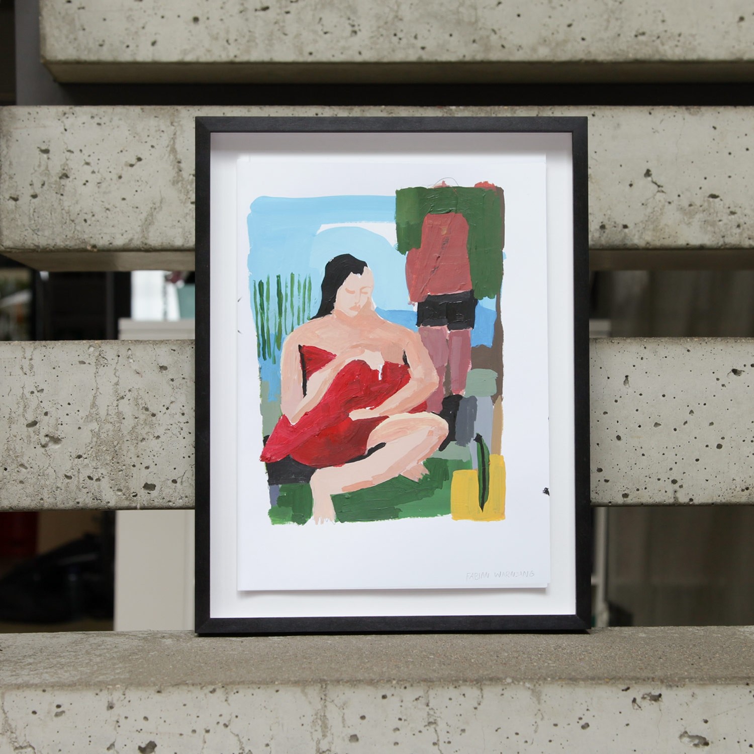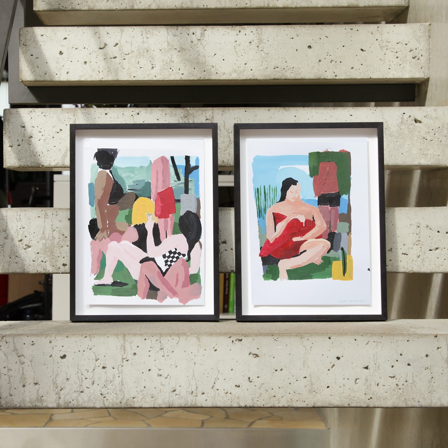 Fabian Warnsing Hot Day Study 3, 2022 Material Acryl und Bleistift auf Papier Auflage 1 Maße 29,7 x 21,0 cm UNIKAT signiert und betitelt Details zum Rahmen Handgefertigter Ahorn-Holzrahmen, schwarz gebeizt und gewachst, Außenmasse ca. 34,9 x 26,2 cm, 10mm Distanzleiste, das Blatt ist hochgestellt montiert, inkl. Museumsglas und rückseitiger Aufhängung. Die neue Art, Kunst zu kaufen Handverlesene, exklusive Editionen Limitierte, signierte Auflagen Top-KünstlerInnen und Rising Stars Schnell registrieren, um Preis und Verfügbarkeit zu sehen. Jetzt kostenlos Mitglied werden Bereits Mitglied? Über das Werk Ob Stillleben oder Akte – der Künstler Fabian Warnsing greift immer wieder auf klassische Motive aus der Kunstgeschichte zurück. Die Badenden am See in seinen auf Bleistiftzeichnungen beruhenden Acrylarbeiten aus der Serie „hotdaystudy 1-8“ erinnern an Cézanne, Kirchner oder Katz. Und doch ist bei Warnsing die Zeitgenossenschaft im Blick auf die Körper, Kleider und Konstellationen nicht zu übersehen. Auch digitale Bilderwelten beeinflussen den Maler stark. Allerdings nicht im Hinblick auf Rendering und Perfektion, denn Warnsings Werke legen Arbeitsprozesse und Korrekturen offen, wie sie auch bildästhetischen Fragestellungen nachgehen, etwa zu Flächigkeit und Tiefe, Figuration und Abstraktion. Solche Bruchstellen lassen Raum für Unsicherheit und Assoziation. Trotzdem oder gerade deswegen sprühen Warnsings Bilderfindungen nur so vor narrativer Kraft. Über den Künstler Fabian Warnsing (geb. 1991 in Unna), ehemaliger Meisterschüler im Bereich Freie Kunst an der Kunstakademie Münster, lebt und arbeitet heute in Berlin. 2020 gehörte er zu den Finalisten des Berlin Masters Award. Seine Werke sind in zahlreichen Einzel- und Gruppenausstellungen zu sehen. Ausstellungen (Auswahl) Die König Galerie präsentierte 2022 mit „Rain Drops, Rain Bows“ die erste Solo-Schau von Fabian Warnsing in London. Im Jahr 2021 wurden Werke von ihm am Kunstort Berlin u.a. in der NBB Galerie, der Galerie Droste @ KPM und der Weserhalle gezeigt. Warnsing stellte außerdem 2020 als Finalist der Berlin Masters Foundation aus. Lesenswerte Artikel / Links [Künstlerhomepage von Fabian Warnsing(https://fabianwarnsing.de/) Instagram-Account des Künstlers Mehr Kunst entdecken Philip Grözinger Ohne Titel 5, 2022 Philip Grözinger Ohne Titel 4, 2022 Stefan Marx, Jonathan Meese, Henning Wagenbreth etc Splendid Isolation Mappe (mit 40 Künstler*innen), 2020