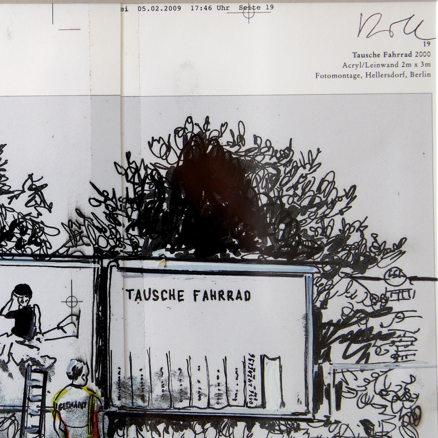 Tatjana Doll Nr. 19, Tausche Fahrrad, 2006/2021 Material Gescannte Handzeichnung, ausgedruckt als Katalogproof, weitergezeichnet, bemalt und handbearbeitet Auflage 1 Maße ca. 31,2 x 41 cm handsigniert inkl. Katalog: Tatjana Doll, DOLL, 2005, anlässl. der Ausstellung "Bier Für Öl + Ein Blinder Passagier" im Kunstverein Bremerhaven, 2005 Details zum Rahmen Inkl. HALBE-Rahmen in Silber + Passepartout, Größe ca. 32 x 42 cm Die neue Art, Kunst zu kaufen Handverlesene, exklusive Editionen Limitierte, signierte Auflagen Top-KünstlerInnen und Rising Stars Schnell registrieren, um Preis und Verfügbarkeit zu sehen. Jetzt kostenlos Mitglied werden Bereits Mitglied? Anfrage senden Über die Werke Der rote Ferrari ist auch eins der Motive in den Unikaten, die auf der Grundlage des Katalogs „DOLL“ aus dem Jahr 2005 entstanden sind. Darin sehen wir Tatjana Dolls Malereien in Form von Collagen in den städtischen Raum montiert. Die linearen Edding-Zeichnungen stammen aus dem Jahr darauf, zunächst waren sie gedacht als Wiederholung des Gedruckten in Schwarz-Weiß, wurden dann gescannt und wiederum als Print aufs Papier gebracht. Die Künstlerin hat sie später manuell durch malerisch-farbige Flächen ergänzt. Zudem holte sie den urbanen Raum dieses Mal in die Zeichnung und die Malerei hinein. „So, als wäre er wie die Malereien, die darin platziert sind, genauso ausgedacht“, erklärt Doll. Wer sich auf ihre Arbeiten einlässt, sollte sich also wappnen für das Wechselspiel zwischen Kunst und Wirklichkeit. „Die Piktogrammschilder ‚Caution‘ habe ich gemalt, um vor meinen eigenen Bildern zu warnen“, sagt sie auch. Die Warnung lässt sich aber ebenso als Aufforderung verstehen, die eigene Vorstellungskraft mindestens so wichtig zu nehmen wie die vorformulierten visuellen Erzählungen, von denen wir umgeben sind. Tatjana Dolls mutiges Werk macht vor, wie das geht. Über die Künstlerin Der Malerei traut Tatjana Doll einiges zu. „Wenn ich einen Ferrari male, dann sollte es so sein, als öffnete ich eine große Lackdose und er würde zu einem Auto schon in dem Moment, in dem ich den Lack auf die Leinwand gieße, nicht durch Ingenieurskenntnisse, sondern einfach durch das Material und die Farbe“, sagt die Künstlerin. Die Grenze zwischen Abbild und Wirklichkeit zieht sie nicht entlang der materiellen Realität. Oft übersteigt die Größe der Alltagsgegenstände in ihrer Kunst die ‚wahren‘ Maße bei Weitem. Genauso wie die Symbolkraft eines Ferraris seine Funktion als Rennwagen und Automobil bei Weitem übertrifft. „Ich wollte malen, was da ist“, erklärt Doll und holt auf diese Weise eine Welt in die Kunst, die uns alle umgibt. Bei Doll ist der Schaffensprozess als ein Akt der subjektiven Aneignung zu verstehen, der Gegenstand an sich tritt hinter das Bild zurück. Möglich also, dass wir in dem LKW-Rücklicht plötzlich nur noch einen gelben Lackfleck sehen – und fernab vorgegebener Denkmuster auf produktivste Art und Weise auf uns selbst zurückgeworfen sind. Ausstellungen (Auswahl) Tatjana Doll stellt als Rompreisträgerin der Deutschen Akademie Rom Villa Massimo gemeinsam mit den anderen ausgezeichneten Künstler*innen aktuell auf Schloss Neuhardenberg aus (bis 31.10.2021). „Was heißt Untergrund?“ ist der Titel ihrer Soloschau im KINDL ‒ Zentrum für zeitgenössische Kunst in Berlin (bis 27.2.2022). 2018 wurde Doll zudem mit dem Konrad-von-Soest-Preis des Landschaftsverbands Westfalen-Lippe ausgezeichnet, ihre Werke zeigte man seinerzeit ebenfalls im Rahmen einer Soloausstellung. Lesenswerte Artikel / Links Webseite von Tatjana Doll 2021 erhielt Tatjana Doll den Fred-Thieler-Preis für Malerei, verliehen von der Berlinischen Galerie „art in berlin“-Interview mit Tatjana Doll (2015